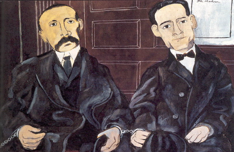 Bartolomeo Vanzetti (izquierda), esposado a Nicola Sacco (derecha) en Dedham, Corte Superior de Massachusetts.