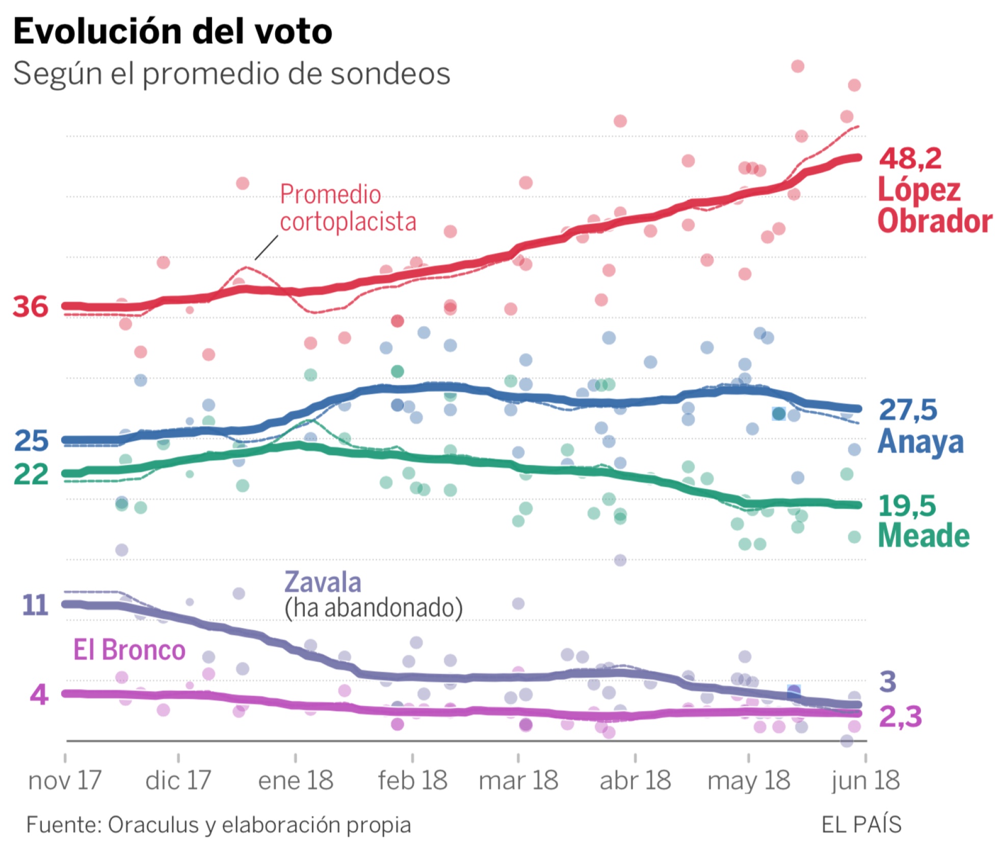 «La ventaja de López Obrador es clara. Ni siquiera los dos debates que se han celebrado hasta ahora, el terreno en el que peor se desenvuelve el tres veces candidato, han mermado su posición en las encuestas».