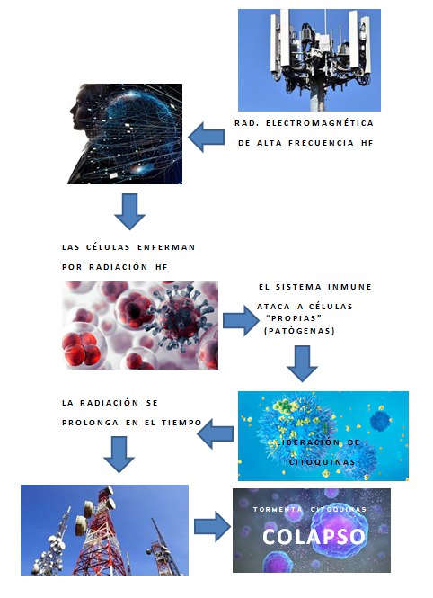 El primer diagrama muestra la vía de la radiación electromagnética de alta frecuencia (HF) desde torres celulares: comienza con afectación cerebral, seguido de células enfermas por radiación HF, ataques inmunes a células propias, exposición prolongada, liberación de citoquinas, tormenta de citoquinas y colapso sistémico. Incluye imágenes de escáneres cerebrales, células virales, torres y liberación microbiana, representando una progresión hacia ruptura sistémica que critica la falta de precaución en el despliegue de antenas.